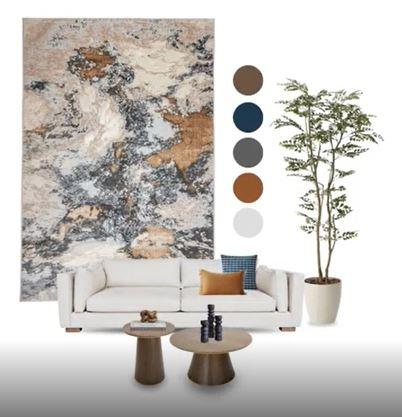 Este moodboard de inspiración contemporánea se construye a partir de un gran tapete de estética marmoleada que marca el carácter del conjunto. Sus vetas en grises, blanco roto y matices óxido generan un juego orgánico y sofisticado, convirtiéndose en el punto de partida cromático y textural. A su lado, una columna de muestras de color —marrón profundo, azul petróleo, gris medio, terracota y blanco cálido— sintetiza la paleta propuesta y aporta coherencia visual.